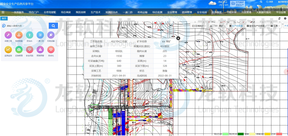(3)基于“一張圖”實(shí)現(xiàn)對(duì)煤礦生產(chǎn)調(diào)度、采煤掘進(jìn)、一通三防、機(jī)電運(yùn)輸、地測(cè)防治水、資源儲(chǔ)量、安全、培訓(xùn)、環(huán)保、科技、黨建、企業(yè)文化、智能監(jiān)控等業(yè)務(wù)數(shù)據(jù)的綜合集成、可視化展示與智能化管理。