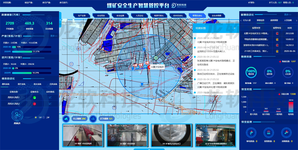 系統(tǒng)以LongRuan TGIS及LongRuan 4D-GIS平臺(tái)為基礎(chǔ),依據(jù)“工業(yè)互聯(lián)網(wǎng)+智慧礦山”綠色開(kāi)采、高質(zhì)量發(fā)展的運(yùn)營(yíng)技術(shù)路線,采用礦山多維GIS“一張圖”管理理念,將煤礦“采、掘、機(jī)、運(yùn)、通”等主要生產(chǎn)系統(tǒng),以及井下環(huán)境安全、人員定位等實(shí)時(shí)系統(tǒng)進(jìn)行融合,形成全面感知、實(shí)時(shí)互聯(lián)、分析決策、自主學(xué)習(xí)、動(dòng)態(tài)預(yù)測(cè)、協(xié)同控制的安全生產(chǎn)智能化管控平臺(tái),對(duì)井上下海量多源異構(gòu)數(shù)據(jù)可視化展示、分析、挖掘和利用,實(shí)現(xiàn)礦井多部門(mén)、多專(zhuān)業(yè)、多管理層面的數(shù)據(jù)集中應(yīng)用、交互共享和決策支持,實(shí)現(xiàn)各主要業(yè)務(wù)系統(tǒng)的智能操控與協(xié)同聯(lián)動(dòng)控制,服務(wù)于智能綜采、綜掘、通風(fēng)、提升、運(yùn)輸?shù)葮I(yè)務(wù)部門(mén),為企業(yè)領(lǐng)導(dǎo)層正確決策提供科學(xué)依據(jù),使領(lǐng)導(dǎo)和管理部門(mén)能夠及時(shí)、全面、準(zhǔn)確地掌握情況,實(shí)現(xiàn)對(duì)“地域、業(yè)務(wù)”的全覆蓋,提升煤礦安全生產(chǎn)管理水平。
